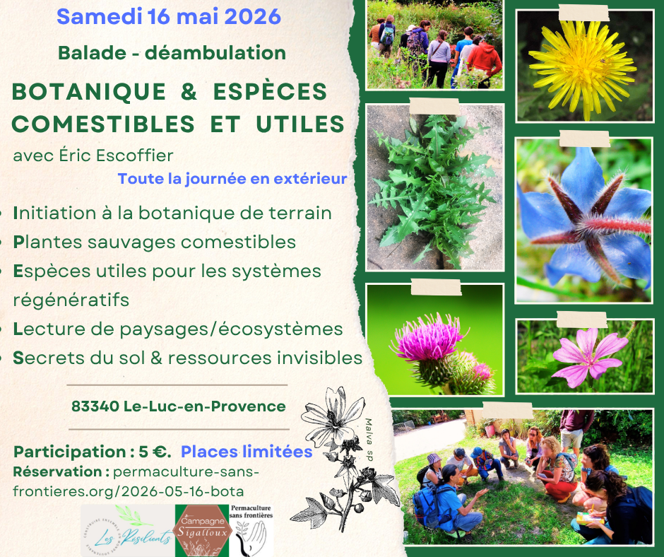 Co-organisée par l'association "Les Résilients - Territoires Locaux Globaux et Singuliers", l'association "Les Jardins Sigalloux" et "Permaculture sans frontières".